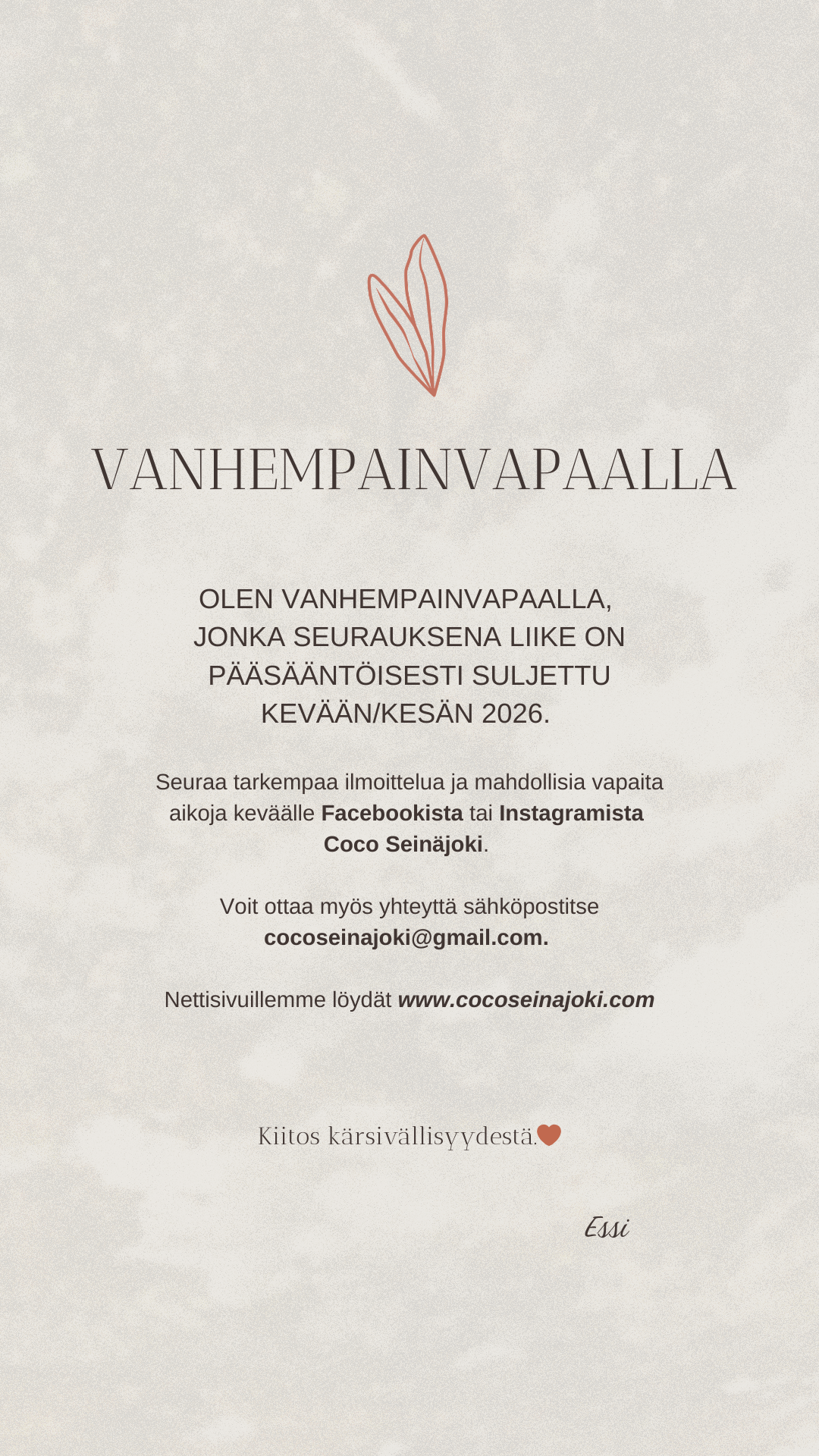 Luvassa on pieniä muutoksia ja uudistuksia vanhempainvapaan aikana, joita voit seurata Facebookista ja Instagramista!